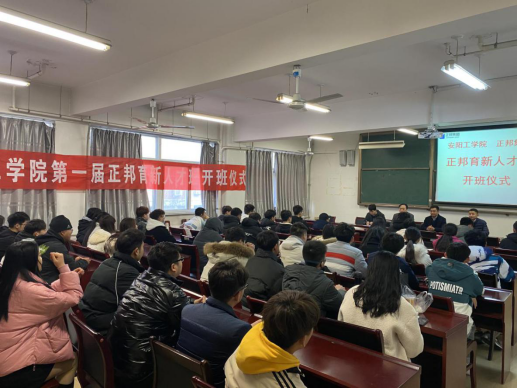 12月10日,安阳工学院与正邦集团校企合作开设第一届“正邦育新人才班”开班仪式在beat365正版唯一官网二楼会议室举行。正邦集团人力资源校招高级经理王昊苏、beat365正版唯一官网副院长王国栋、动物医学教研室主任宋玉伟、校招河南经理胡立强和第一届参加开班仪式。