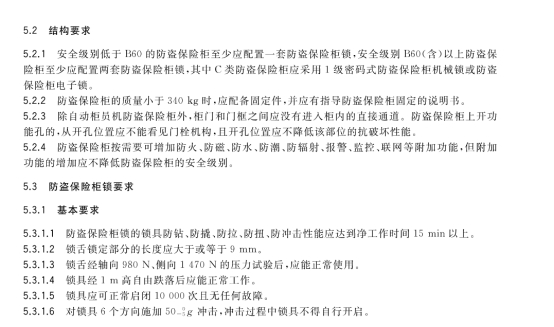5.2.2存入场所(部位)的防盗安全门应符合GB17565的要求,其防盗安全级别为乙级(含)以上;防盗锁应符合GA/T73的要求;防盗保险柜应符合GB10409的要求。