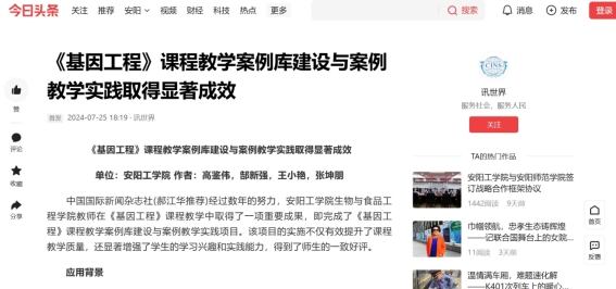 1.中国国际新闻报:《基因工程》课程教学案例库建设与案例教学实践取得显著成效