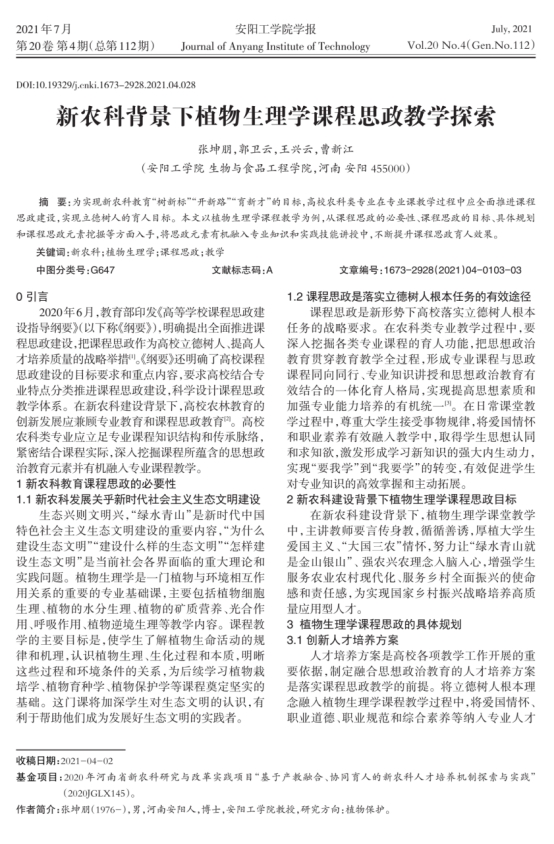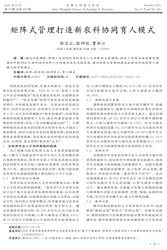 基于产教融合、协同育人的新农科人才培养机制探索与实践-论文论著